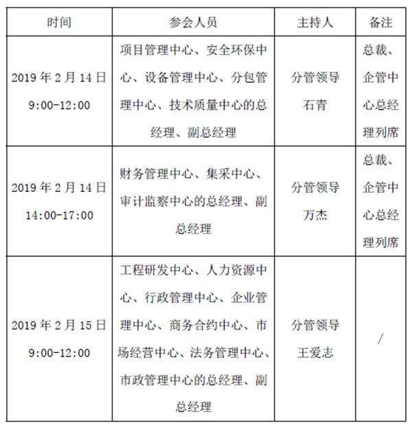 三、【時間】:2019 年 2 月 14 日-15 日,具體安排見“具體安排” 。四、【地點】:集團總部二樓會議室