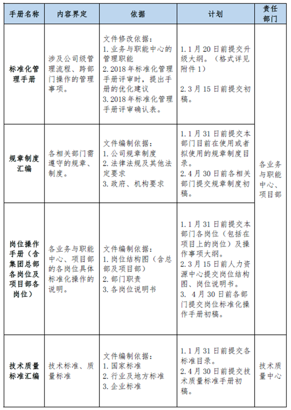 1. 標(biāo)準(zhǔn)化管理手冊(cè)編制大綱是以手冊(cè)管理事項(xiàng)為單位,各 部門依據(jù)管理職能、評(píng)審時(shí)的優(yōu)化建議以及所簽署的《2018 年標(biāo)準(zhǔn)化管理手冊(cè)評(píng)審確認(rèn)表》中相關(guān)整改措施,按附件 1