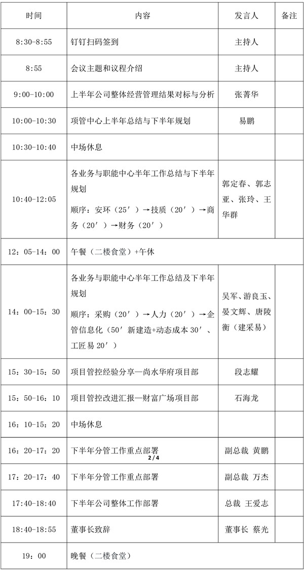 4. 各部門和項目部需在一周內(nèi)分別召開內(nèi)部專題會,傳達(dá)年中經(jīng)營會會議精神,部署下半年重點工作,明確實施計劃與分工,抓好各項工作的落實。