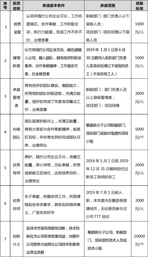 備注:獎(jiǎng)項(xiàng) 1、3 的參選人員需是 2019 年 1 月 1 日之前入職且連續(xù)工作滿 1 年的員工。
