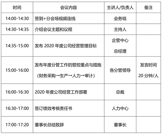 1) 各分管領(lǐng)導針對公司正式發(fā)布的年度經(jīng)營目標,組織各自所分管的部門完成年度工作計劃與措施的完善和溝通確認工作。