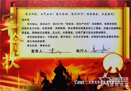 安全至上,誓言如磐。集團(tuán)副總裁黃鵬帶領(lǐng)各項(xiàng)目經(jīng)理及相關(guān)安全負(fù)責(zé)人鄭重宣誓、簽訂軍令狀和目標(biāo)責(zé)任書(shū),進(jìn)一步夯實(shí)全員安全生產(chǎn)責(zé)任,讓安全意識(shí)真正根植到每一位員工心中,使安全理念內(nèi)化于心、外化于行、固化于制,確保項(xiàng)目安全生產(chǎn)。