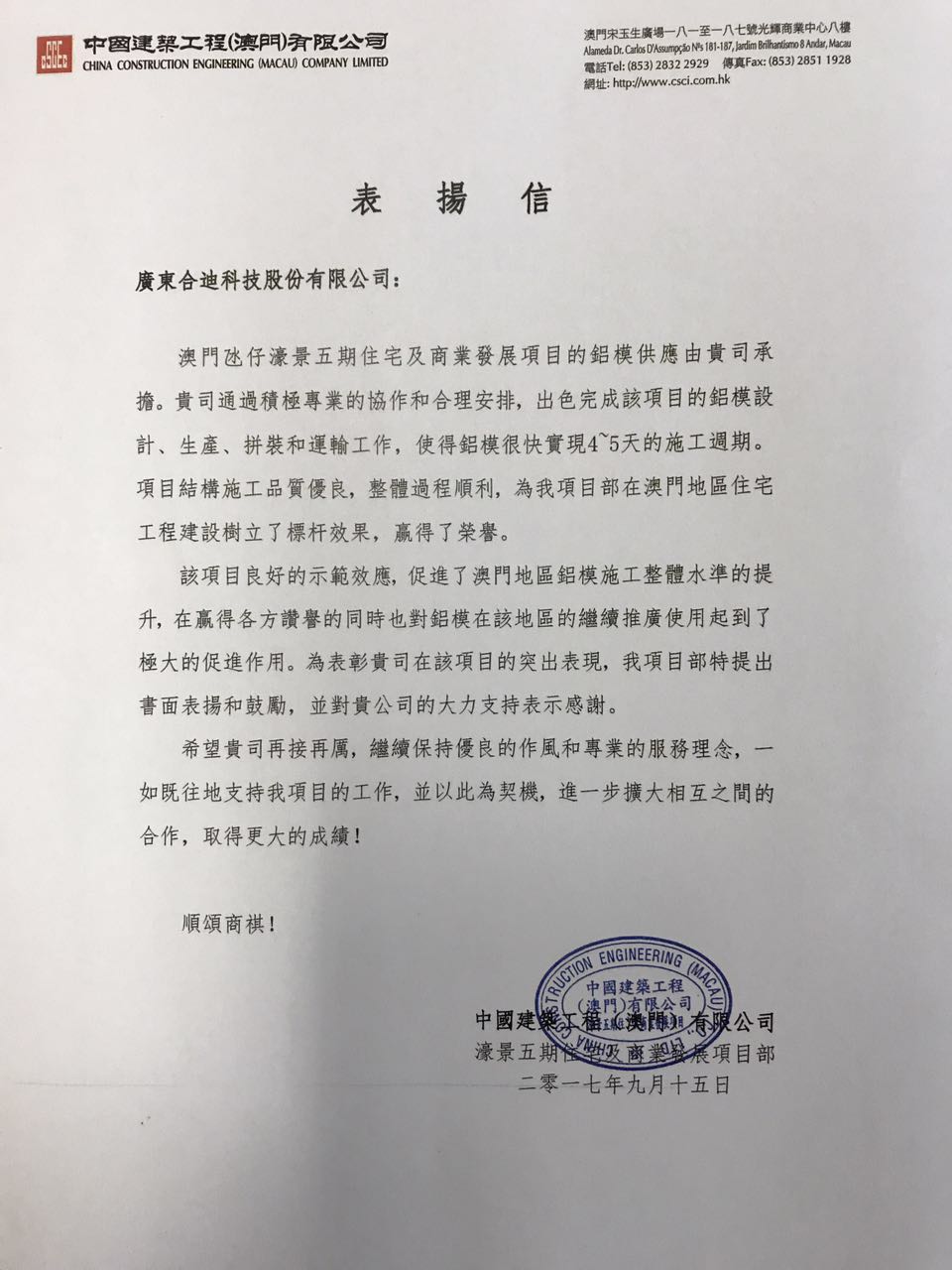 集團下屬公司合迪科技鋁合金模板又獲贊譽