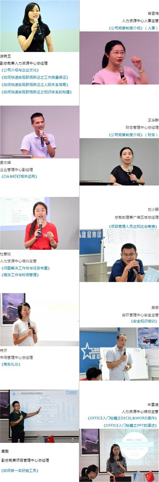 本次培訓(xùn)邀請到了強(qiáng)大的內(nèi)訓(xùn)講師團(tuán),他們或親切睿智、或幽默風(fēng)趣、或嚴(yán)謹(jǐn)細(xì)膩。講師們結(jié)合自己的職場經(jīng)驗,為星青年們傳遞建星企業(yè)文化、分享在建星成長路上的所思所想,讓星青年們迅速地了解建星、融入建星、愛上建星。