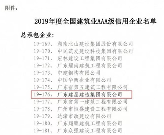 近日,由中國建筑業(yè)協(xié)會(huì)組織的“2019年度全國建筑業(yè)AAA級(jí)信用企業(yè)”評(píng)選結(jié)果正式公布,建星集團(tuán)等215家總承包企業(yè)上榜。這是公司繼2014年度以來連續(xù)三次獲評(píng)該項(xiàng)榮譽(yù)。